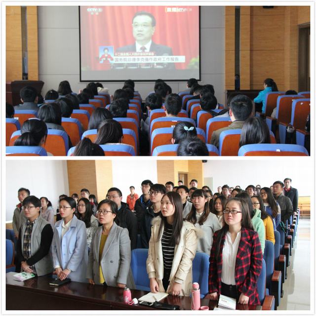 3月5日上午9时,2013级本科生辅导员周静组织全体员工党员、员工干部在致知楼六层报告厅观看第十二届全国人大第四次会议开幕式。师生一起聆听政府报告,感受国家发展历程 ,明确“十三五”时期的主要目标任务和重大举措。要求广大党团干部关注国家发展、政府运作,将自身成长与祖国命运连接起来,牢固树立主人翁意识,立足本职本岗,为国家的发展壮大添砖加瓦。