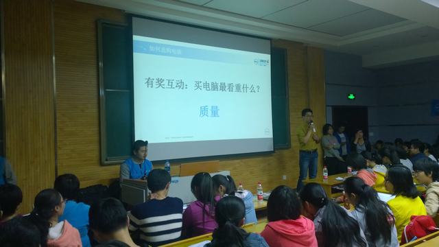 活动中,刘海涛为在场员工讲述了各种类型电脑的优缺点,教授同学们挑选电脑的技巧及升级电脑配置的方法。随后,他向在场同学介绍了电脑行业的发展历史以及戴尔企业文化。此外,他还通过讲述老员工职业生涯规划以及其他成功的老员工活与毕业后的发展,向大家传授了如何度过老员工活的经验。讲座最后,现场观众参与了抢答环节,整场讲座的气氛达到了高潮。