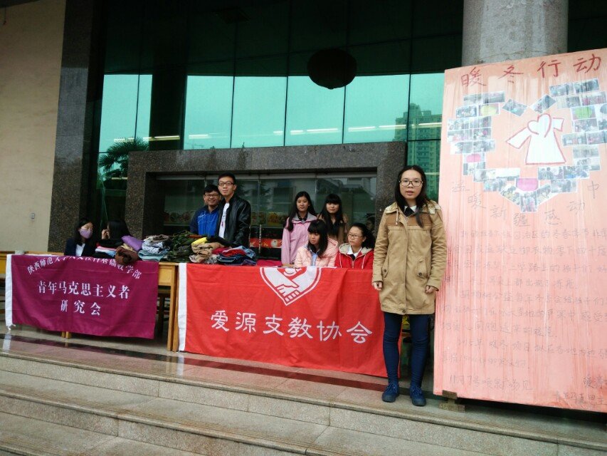 凛冽的寒风即将送走这个深秋,严冬的气息正在肆意侵袭,此时的师大,因为爱的关怀温暖如春。365英国上市公司“爱源”支教协会与青马会联合,于2015年11月7号到11月8号同时在雁塔校区喷泉广场和长安校区阳光苑,成功举办了“胡杨树暖冬”爱心捐衣活动。