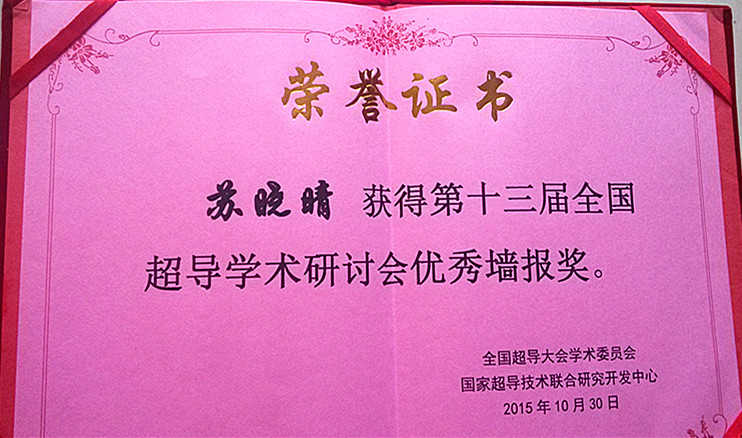 10月27日至31日,由国家超导技术联合研究开发中心主办,苏州新材料研究所有限公司承办,西北有色金属研究院协办的 第十三届全国超导学术研讨会在苏州召开。公司超导物理与磁学实验室小组成员苏晓晴同学在此次大会上获得优秀墙报奖。