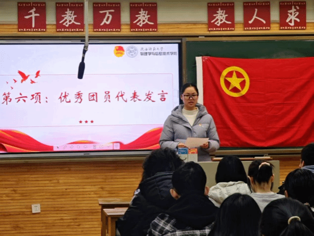 随后,在优秀团员代表的带领下,全体新团员面向团旗高举右拳,庄严宣誓,许下对团组织的忠诚承诺。朱婧、于泽华两位同学代表新团员进行发言,陈佳欣、聂晨涛两位同学作为优秀团员代表进行发言。