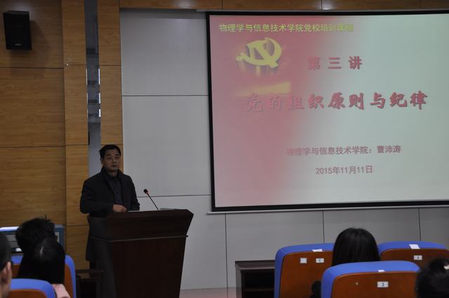 开班仪式按照四个流程进行。首先,张文婷宣读了党课开班计划,详细阐述了本期培训班的上课时间及其内容安排。紧接着王非宣读培训班的五点要求,旨在督促每一个积极分子按时上课、认真听讲,要求员工在党课结束后按时保质保量的完成此次培训的统一测评以及上交思想汇报。然后,2013级员工党支部书记任芷萱宣读党课分组及其成员。在第一讲中,物理公司党委书记曹沛涛老师为员工讲解了《党的组织原则与纪律》,分别介绍了党、民主集中制、民主集中制原则、民主集中制对无产阶级政党的意义以及为什么说民主集中制是科学合理有效的制度。他结合老员工的学习、生活现状分析了员工的思想状态以及学习意识,幽默的讲课风格抓住了员工的注意力,使员工获益匪浅。