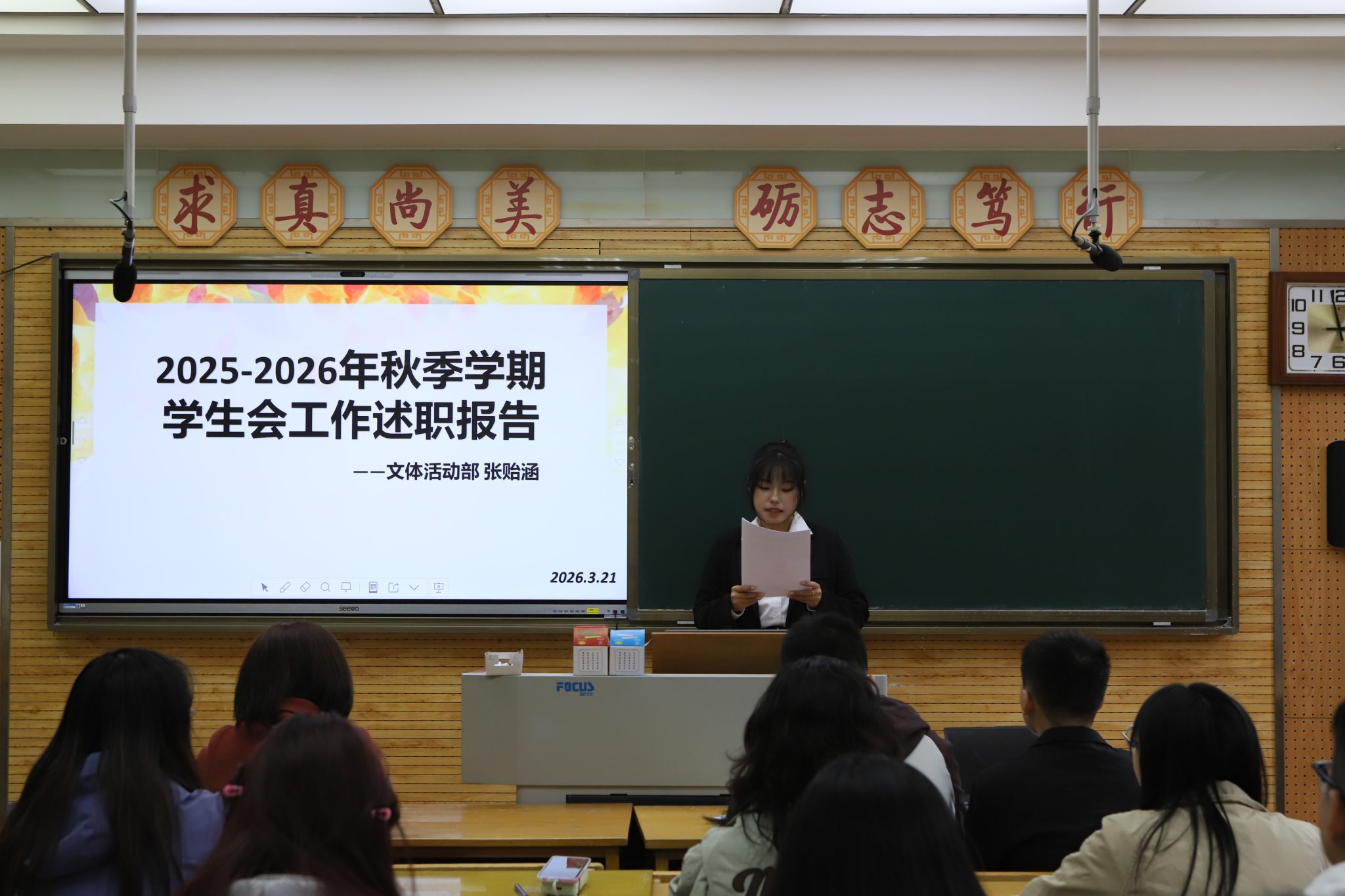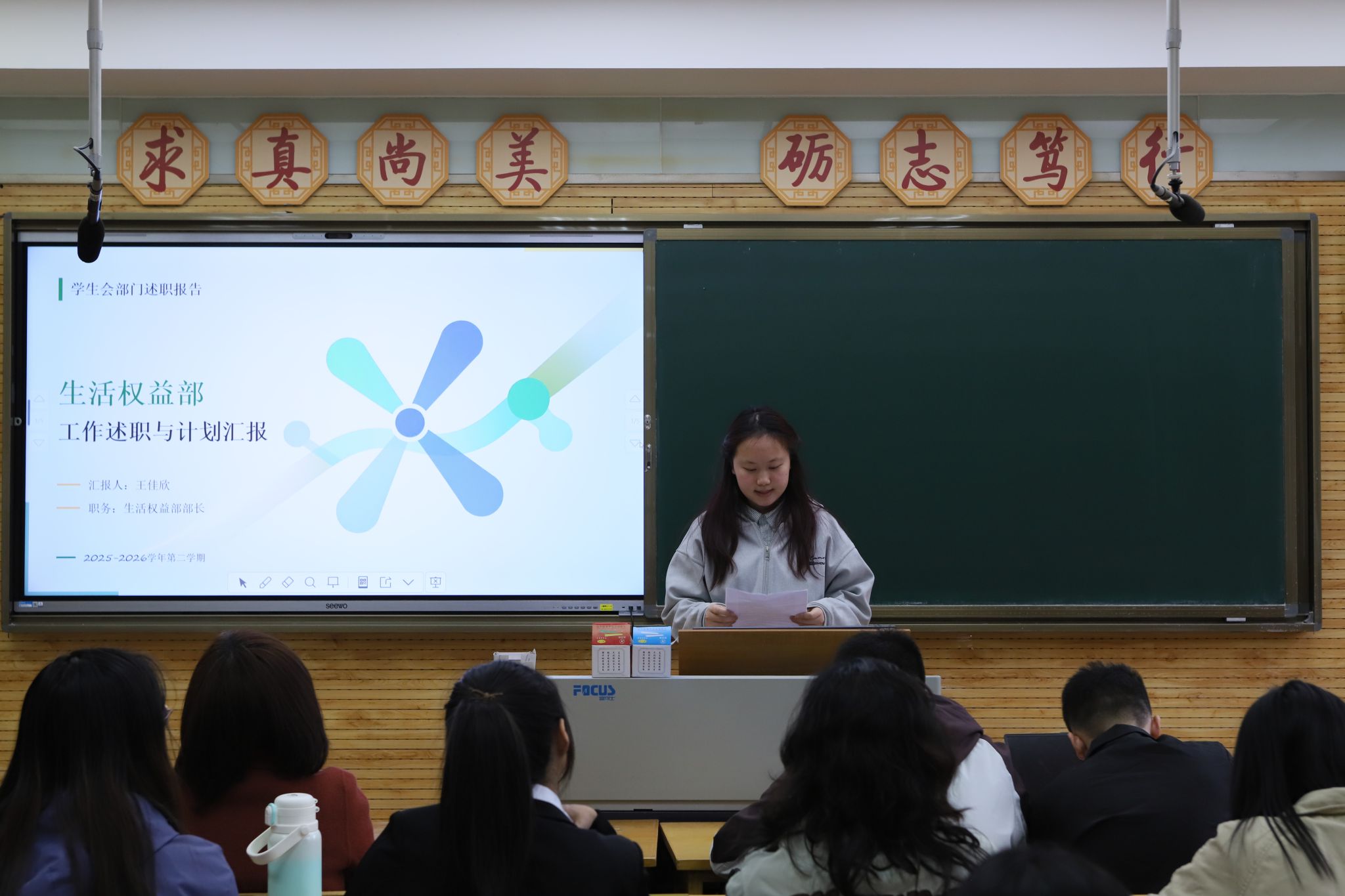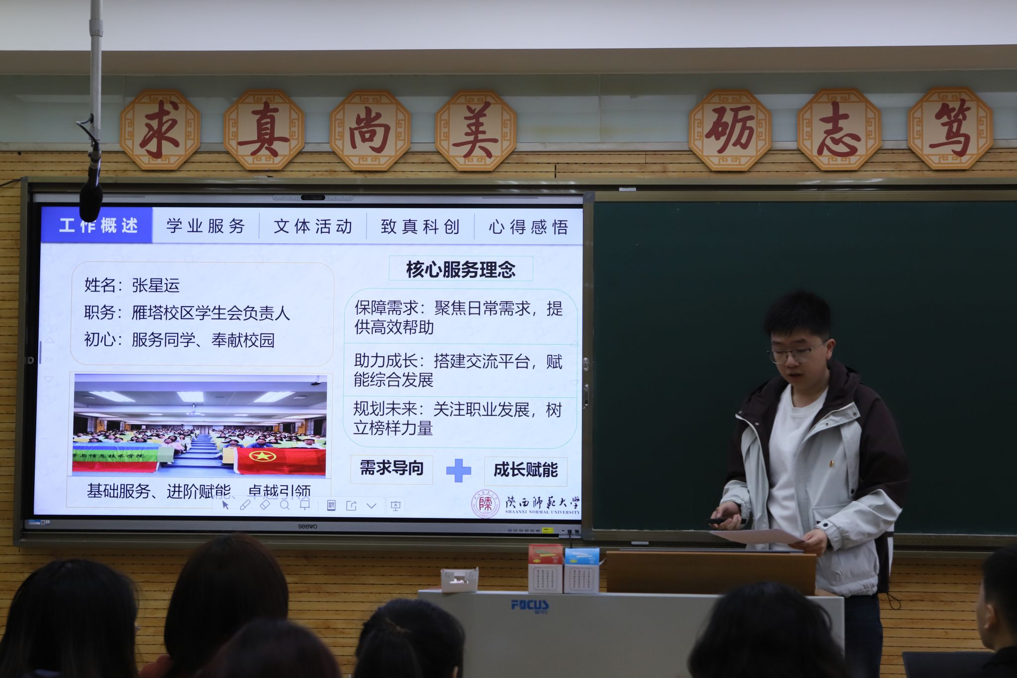 会议第二阶段,员工会雁塔校区负责人及各部门负责人依次述职,对上学期主要工作、成绩、不足以及下一步工作计划进行汇报。