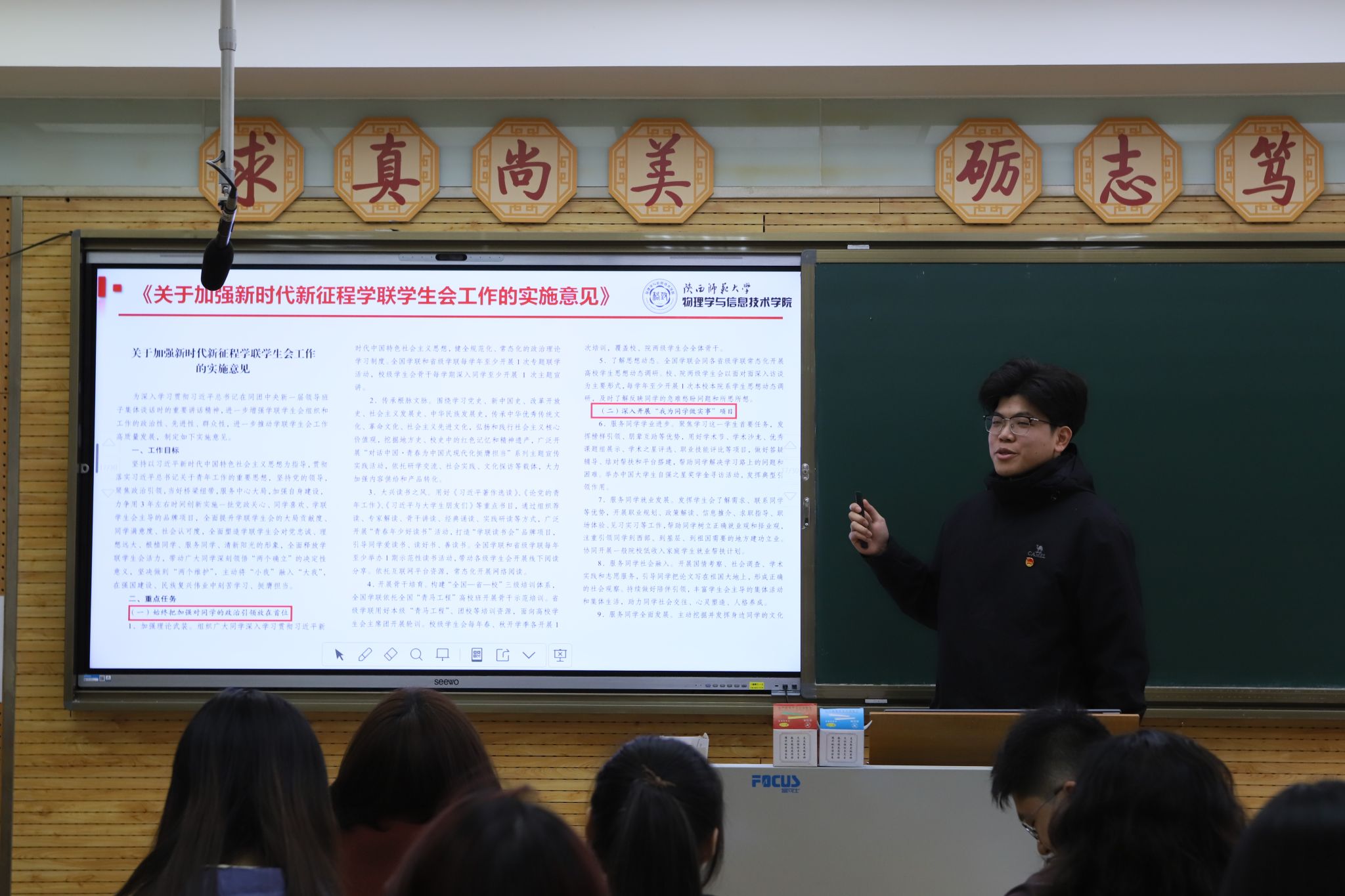 第三阶段,院员工会执行主席王鹏基对新学期工作方向进行安排。他首先深入领学全国学联《关于加强新时代新征程学联员工会工作的实施意见》文件,紧接着强调“批评与自我批评”的重要性,剖析了上学期员工会工作存在的不足。随后,他对本学期主要工作进行了说明,着重强调了思想引领、精准服务、动员实践、自我强化等四个努力方向。