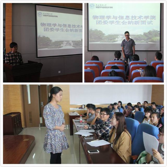 此次面试采用自我陈述与负责人提问相结合的模式。即两分钟自我陈述,介绍自己以及对竞聘岗位的认识,随后由主席团成员针对个人特点及岗位职责进行提问。2013级各班同学对员工会工作热情高涨,都希望能为公司员工工作贡献出自己的一份力量。在面试过程中,同学们清晰的工作目标和多彩的个人才艺都得到了很好的表现。学霸、舞王、演说家、技术宅都以自己的方式表达对员工会的向往和对员工工作的热爱。最后,为了对各位应聘同学的工作职能进行合理分配,面试负责人精心设计了工作情景以考察面试者的实际处理问题的能力。在此环节中,同学们沉着冷静的表现,机敏睿智的反映,得到了主席团成员的一致认可。