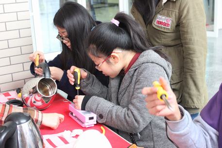 上午九点,科技部和科协的工作人员们冒着阴雨天气,在阳光苑一层门口摆放好座椅,准备好了各类修理工具,热情地向过往的同学介绍活动,希望更多的同学能够了解并参与此次活动。