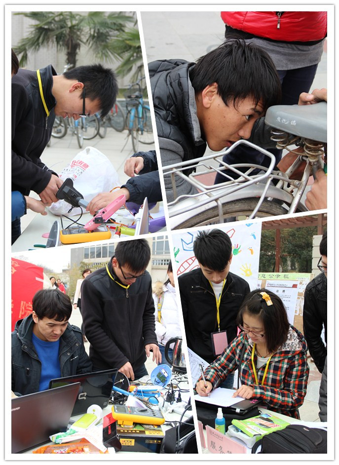 上午九点钟,科技部的工作人员们冒着寒风,在阳光苑广场已经摆好桌椅,准备好了工具,热情地向过往同学介绍活动,希望更多的同学能了解并参与此次活动。义务维修队的队员们全神贯注、尽心尽职,很多人甚至牺牲了午饭的时间来帮助全校的同学们解决力所能及的问题。他们有的在一旁耐心修理自行车部件,并给车一一打气;有的仔细检查需要维修的各类小电器,找出问题所在,在最短的时间内进行了修理;有的则认真小心调试电脑,判断故障,在利索解决问题的同时,也教会了同学们一些电脑维护方面的知识。看到同学拿到修好的电脑、心爱的台灯后的笑脸,队员们也露出了舒心的笑容。他们热情的服务,认真负责的态度感染了前来寻求帮助的同学,服务场地人来人往。此次活动持续到下午三点钟才结束。