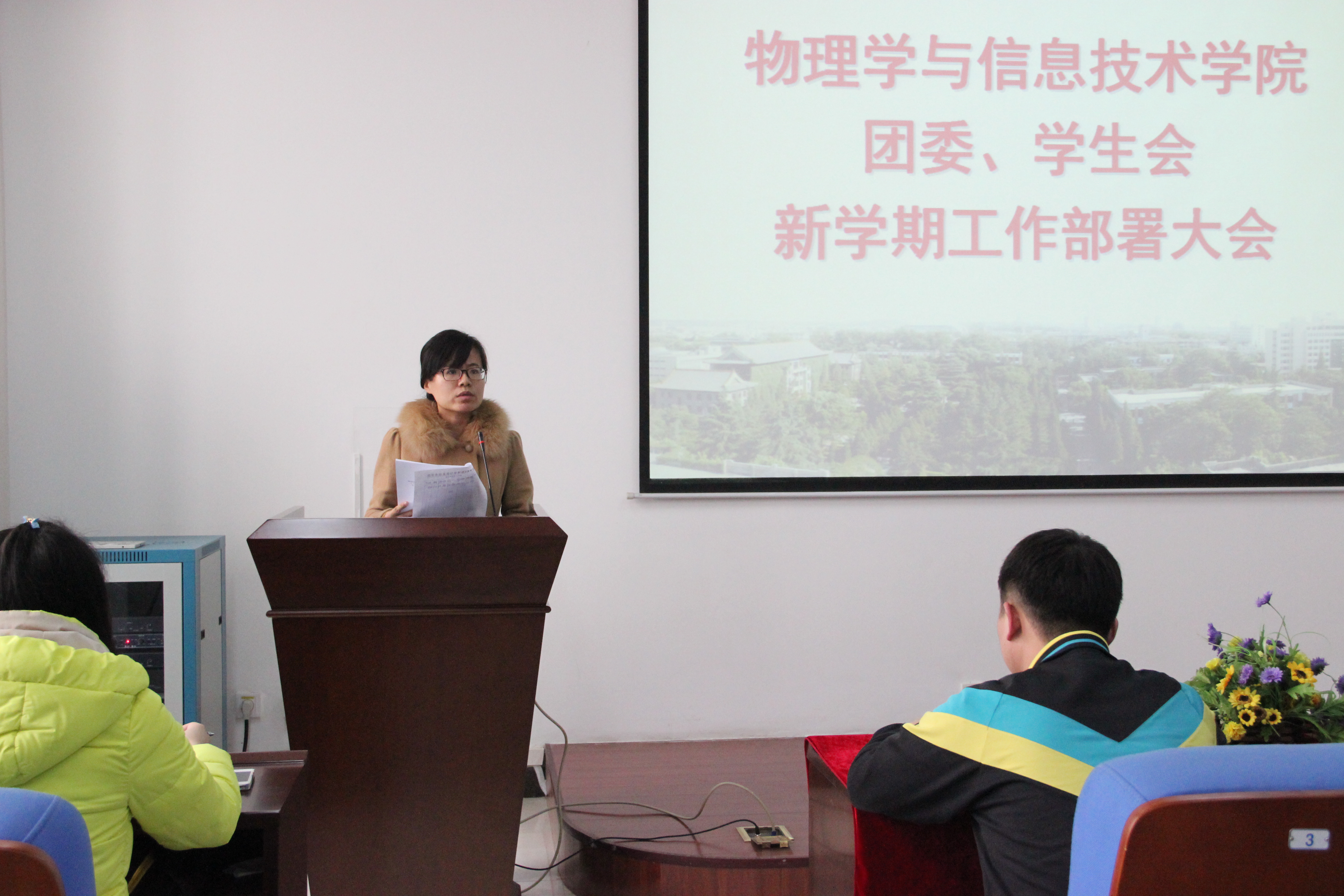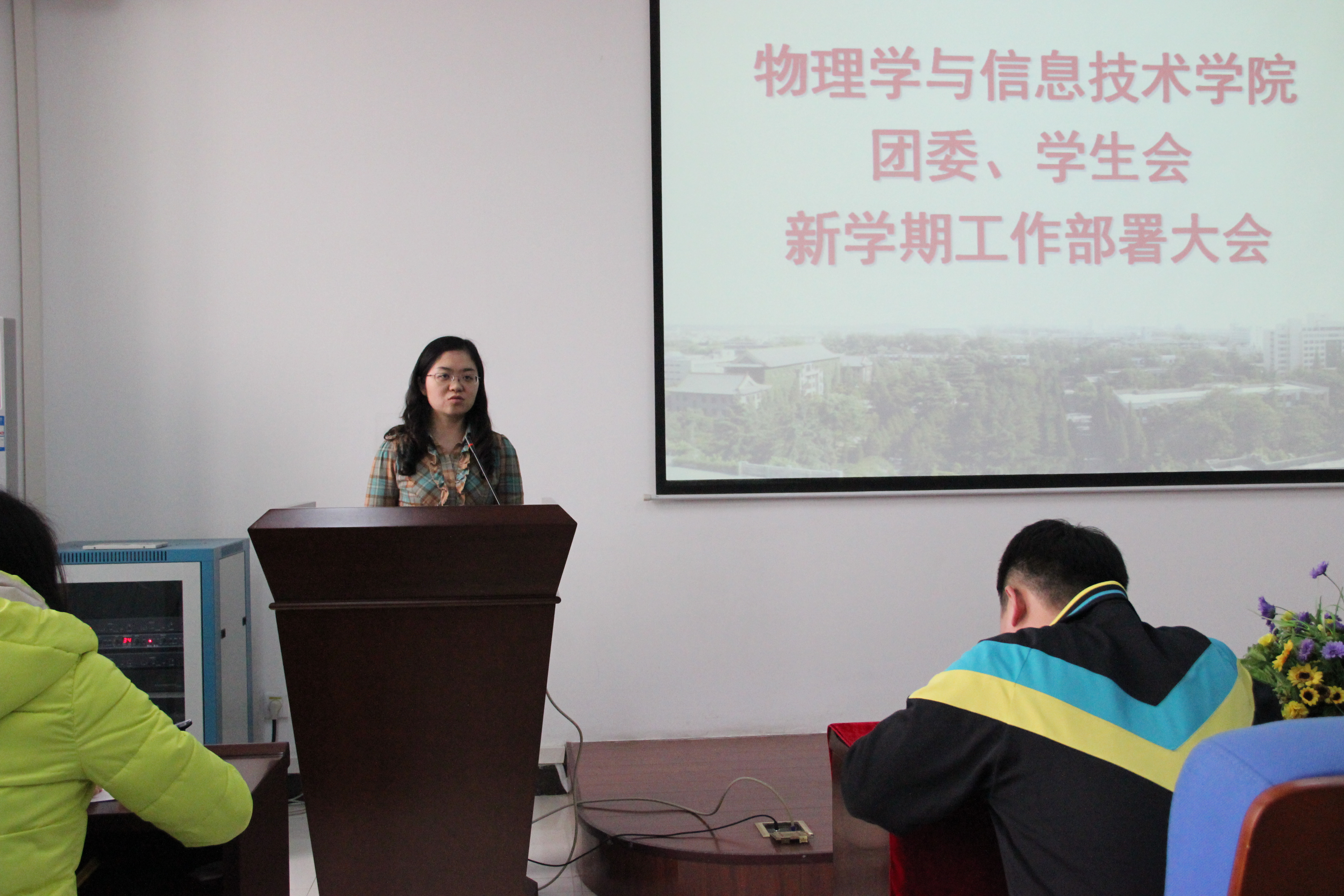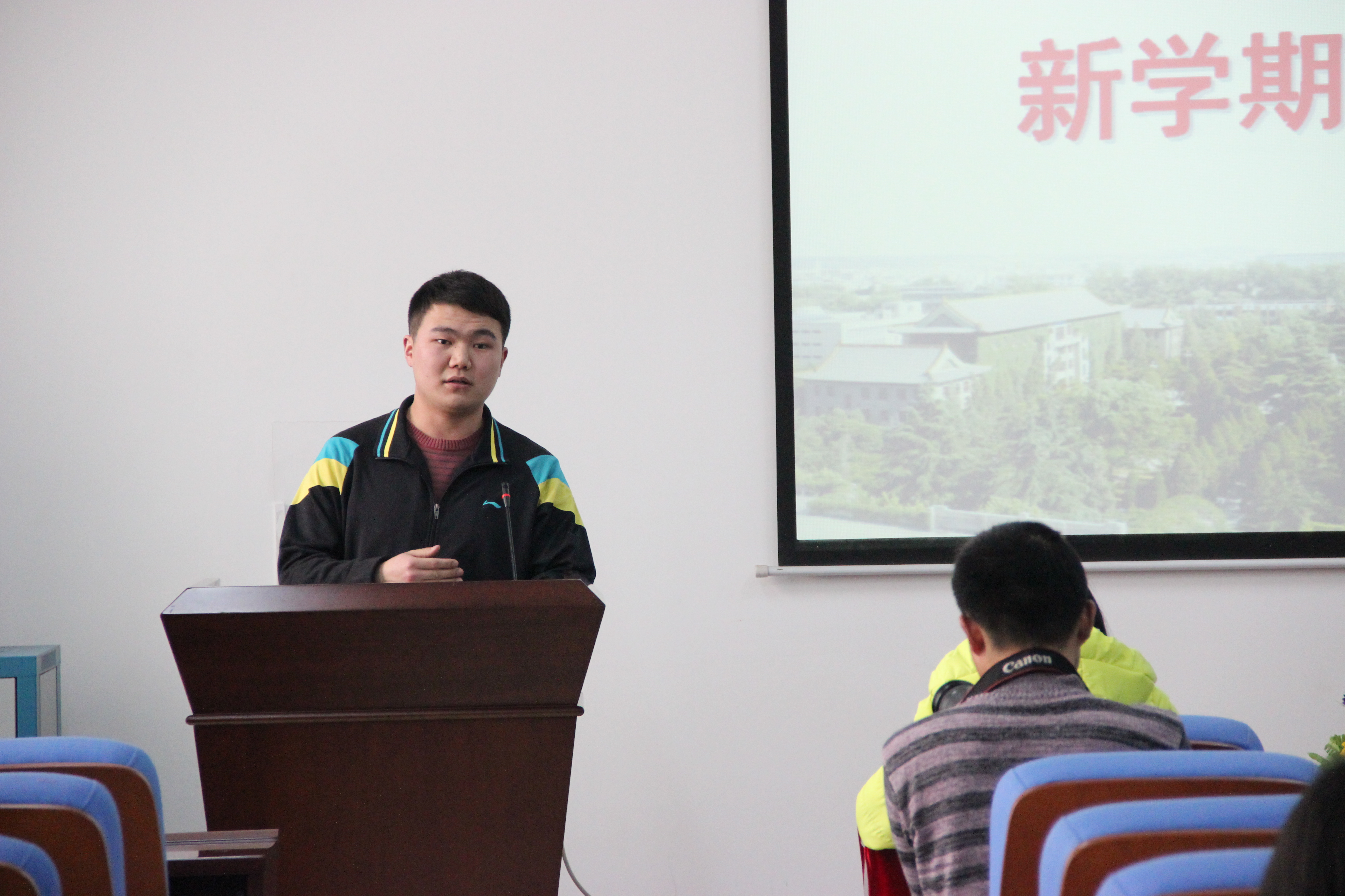 随后,公司团委书记曹宇巍发表讲话。曹老师首先对全体员工干部为公司员工工作所贡献的智慧和付出的辛苦努力表示感谢,同时,希望大家能够继续保持上学期积极的工作态度和优良的工作作风,创造性的开展一些结合专业学习、学科特点,员工真正愿意参与并能从中受益的活动,努力打造具有公司特色的精品校园文化活动,更好地为广大同学服务。接着,曹老师强调了本学期员工工作的总体思路和主要任务,包括公司特色精品活动——第三届“综合实验技能拓展活动月”、重点推进工作——优良学风建设系列活动和常规工作——运动会等。最后,曹老师对全体员工干部提出了要求和希望:一是努力学习,以身作则,发挥榜样的带头示范作用;二是找准位置,明确责任,做好老师和同学间的桥梁和纽带;三是履职尽责,勇于担当,创造性的开展本学期的工作。