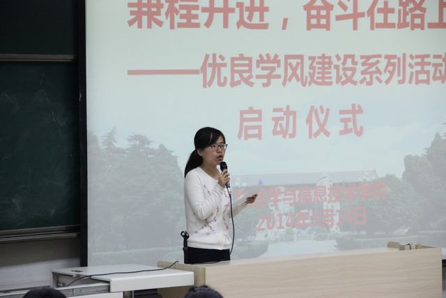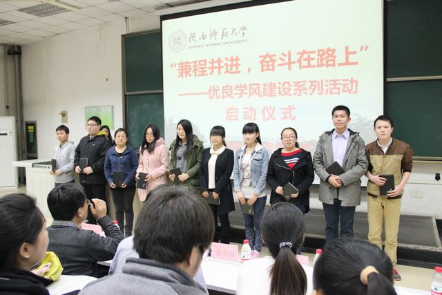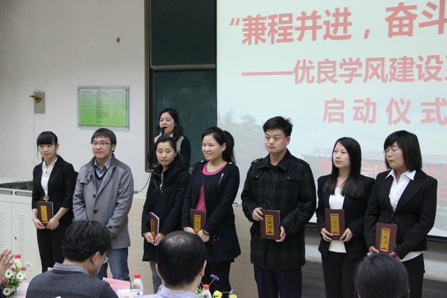 2011级本科生辅导员周静为大家介绍公司“兼程并进,奋斗在路上”---优良学风建设系列活动方案。本次系列活动,共分为11个子项目。项目时空交织,以宿舍建设为抓手,以特色活动为载体,计划通过举办恳谈会、动员会、设立党员示范监督岗和结成“一对一”学习组等形式,帮助受警示同学在学习的道路上兼程并进,奋起直追,同时也督促全院本科生养成“厚德、积学、励志、敦行”的良好品质。随后,各位领导老师为参加本次学风建设活动并担任本科生各个班级“班主任”的研究生颁发了聘书,为公司党员、干部颁发了工作日志本。