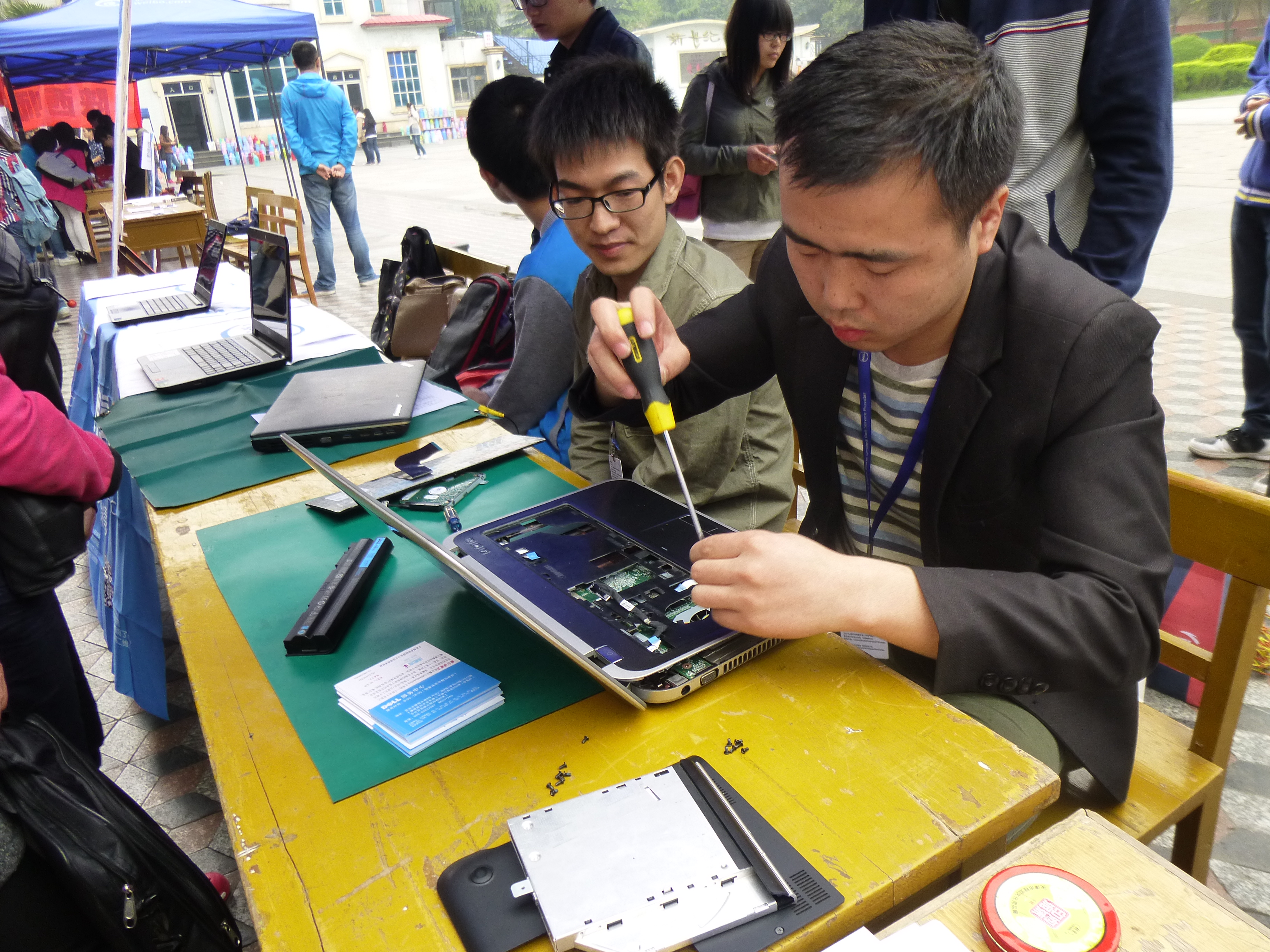 本次义务维修经过长达一个月的周密部署,于12日上午九时准时开始。活动开展时场内已有许多同学排队登记,现场负责人热心解答同学们的问题,对同学们的电脑问题进行分类,分配到不同的工程师线下,条理分明,高效快捷。在工程师认真维修的同时,电子协会为等待的同学们介绍电脑养护的知识,受到了广大同学的一致好评。