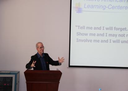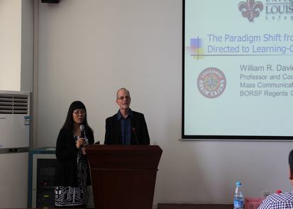 下午2点30,报告正式开始。Davie教授首先就信息化时代美国大学教学理念和方式的转变向大家作了精练的介绍,使得听众对于近年美国大学教学改革的情况有了一定的了解。随后,Davie教授分别从应用操作能力培养、数量统计能力提升、高质量学习、未来发展方向等方面详细阐述了美国高校如何根据时代需要的变化确立、实施以学习为中心的教学模式。在应用操作能力培养方面,Davie教授向大家展示了自己在教学中,引导员工进行自主采集信息,创作新闻,并通过教授所主持的电台制作、播出节目而提升实际应用操作能力的过程。在数量统计能力提升方面,Davie教授则详细讲述了自己带领员工前往路易斯安那州农业局进行信息调研、撰写研究报告的事例。通过对众多例子的讲解和剖析,在座的老师与员工们深切地感受到美国高校教育、教学理念的先进性和高校教师在教学互动时对于自身角色精准的定位和把握。