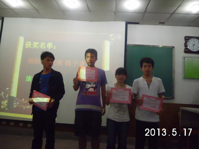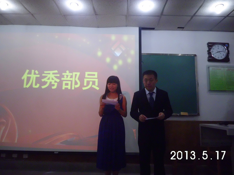 部员彭发带来的精彩机械舞表演拉开了此次活动的序幕,现场气氛顿时高涨。在颁奖环节中,会长马涛分别给羽毛球、乒乓球团队的前三颁发了获奖证书和奖金,同时也给获得团队第四的队伍颁发了优秀奖。在本次团体赛中的优秀裁判、工作人员、运动员也分别获得了荣誉证书。同时也颁发了为社团工作一年的部长、副部长的奖项,主席团人员为她们颁发了奖状并合影留念。颁奖结束后,副会长李腾对过去一年中骄阳的发展进行了总结,各部长也分别从各部室角度出发对这一年的工作进行了回顾。期间部员胡欢欢和夏云晖同学带来的歌曲表演不断将现场气氛推向高潮。会长马涛在总结中回顾了骄阳在过去一年的点点滴滴,分析了社团仍然存在的不足,肯定了大家取得的优秀成绩,以及对下届的期望。最终,本次活动在欢快愉悦的气氛中落下帷幕。