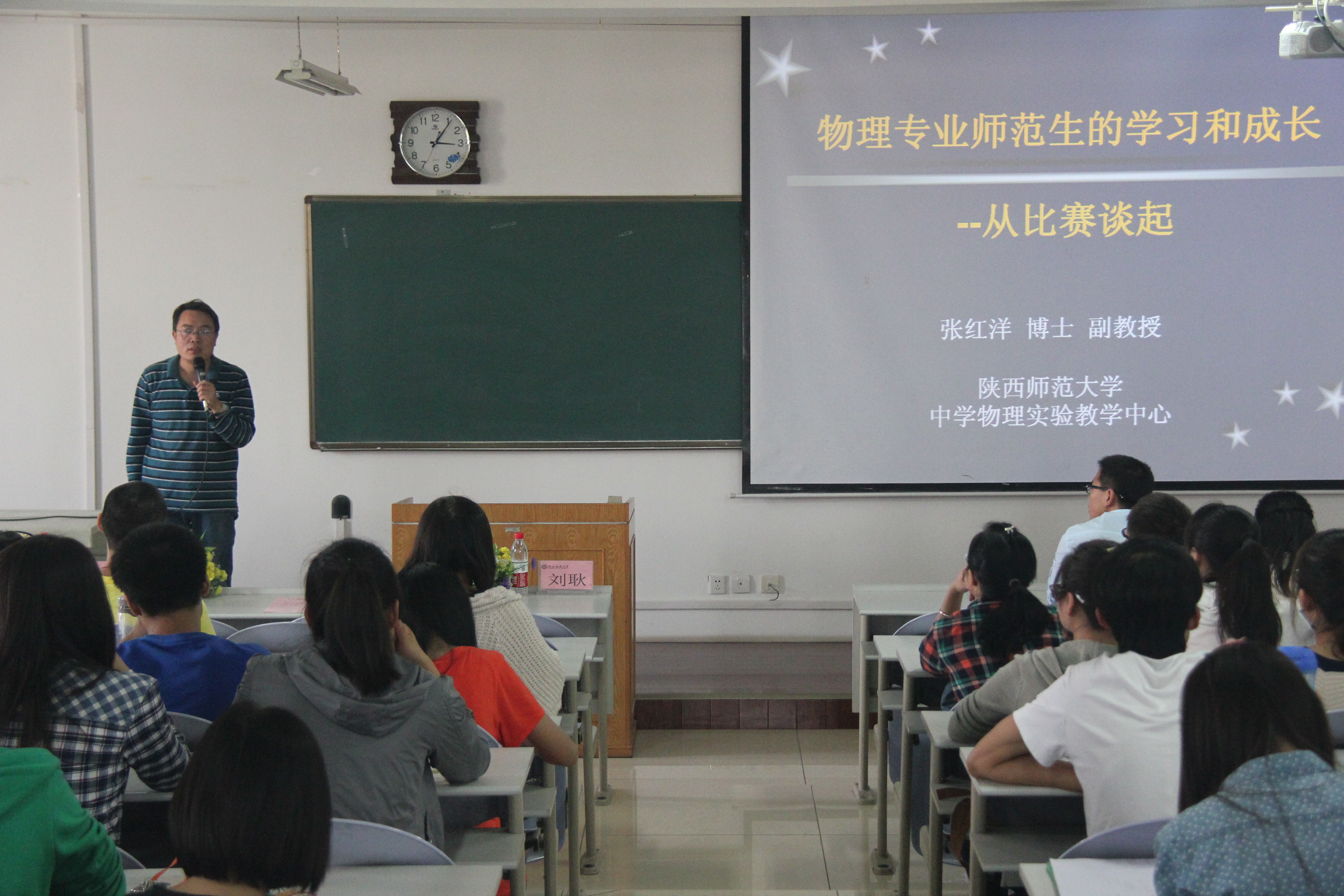 启动仪式结束后,张红洋副教授为同学们做了题为“物理专业师范生的学习与成长”的精彩讲座,他主要从“到底要做什么、能做什么、擅长什么、喜欢什么”等四个方面为同学们阐释了如何能够成为一名优秀的教师,帮助同学们准确地进行自我定位。他通过列举陕师大杰出员工仰孝生和“National Teacher”两个例子,提醒同学们首先要热爱教师这个光荣的职业,并做好充分的心理准备,为成为一名优秀的人民教师而长期奋斗,不懈努力。他指出,学高为师,身正为范,一名教师必须要具备相关的法律知识、专业知识和教育理论才能传道授业解惑,实现人生价值,得到社会认可。他还幽默风趣地通过列举乔布斯等实例强调了作为一名合格的教师需要对自己所做的事情有清晰的定位,并要投入大量的时间和精力。他结合麻省理工教授如何教学的事例,为大家介绍了国家、公司举办的各类教学技能大赛的意义以及参加比赛的益处。讲座最后,张老师热情耐心地回答了同学们关于教师职业、教学技能提升等方面的疑问和困惑。