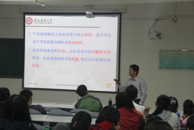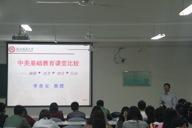 2013年10月14日19:00,公司“师范生教学能力拓展活动月”系列讲座第二场--“中美基础教育课堂比较--碰撞、思考、理念、行动”讲座在长安校区文津楼510教室举行。教务处处长、物理课程与教学论专业硕士生导师李贵安教授应邀担任主讲,2011级师范专业本科生参加了讲座。讲座由2010级本科生辅导员刘耿主持。