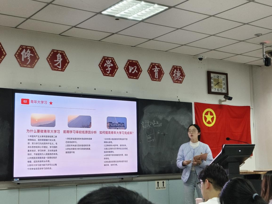第四次课程,学经理安校区团委副书记孙佳学姐和张芊惠学姐图文并茂地为大家讲解了中国共产主义青年团在新时代的基本任务以及基层团组织标准化、规范化建设。张芊惠讲述了中国共产主义青年团在新时代的基本任务,号召大家要认真履行引领凝聚青年、组织动员青年、用社会主义核心价值观教育青年,重点规范了团日活动汇报材料的形式,培训团干部标准化、规范化完成任务。孙佳根据前期团务工作中反映出来的问题,就“如何做好‘上传下答’”“如何提醒广大青年做好青年大学习”“办公系统使用及注意事项”等方面展开讲解,介绍了自己带领本班同学完成“青年大学习”的经验,团干部们受益颇深,也明白了日后怎样更加高效地完成相关团务工作。