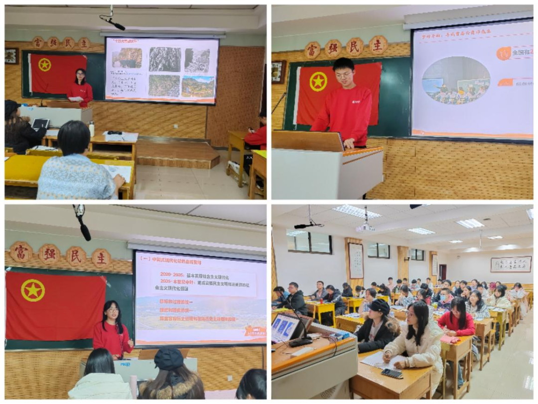 第五次课程,由马克思主义公司新时代老员工理论宣讲团的三位成员——吉丙奇,崔宇杰,张紫琪携手带来。吉丙奇同学首先以中国式现代化为主题,解读了其与中华民族伟大复兴的紧密联系。接着崔宇杰同员工动介绍了那些“筑梦人”——公费师范生的故事,激发了学员们的共鸣。最后,张紫琪同学带领学员们探究了为什么中国共产党在经历种种磨难后仍能枝繁叶茂,让同学们意识到我们青年人的力量是无穷的,新时代仍需人们接继奋斗,继往开来。在三位成员澎湃又有深度的宣讲中,学员们真正理解了什么是中国式现代化,明确了党和人民的使命,认识到师范生的责任与担当。