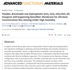 进展2: “Flexible, Breathable and Hydrophobic SnO2–SnS2–SiO2/SiO2 All-Inorganic Self-Supporting Nanofiber Membrane for Ultralow-Concentration NO2 Sensing Under High Humidity”, Advanced Functional Materials 2024, 2410833.