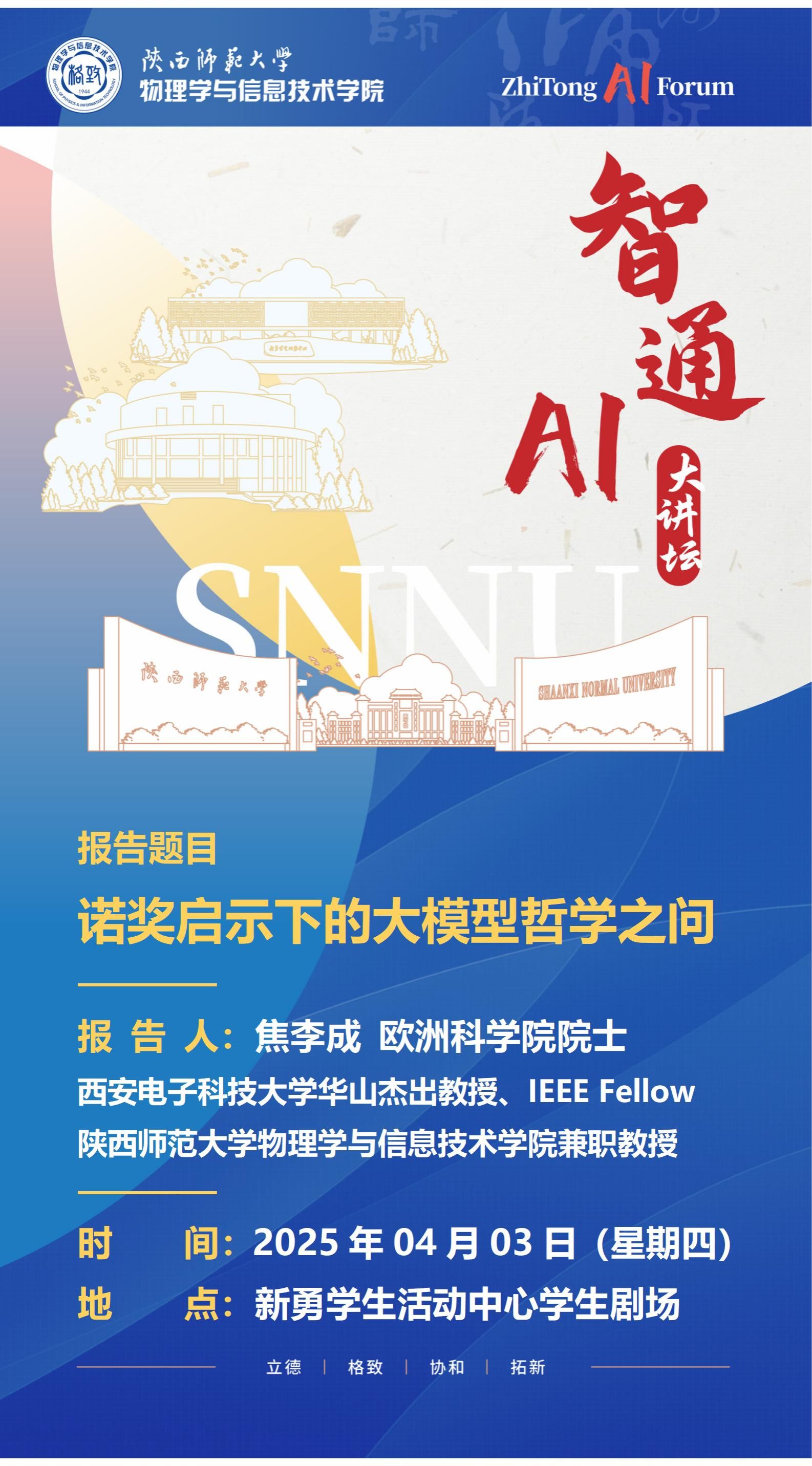 聘任仪式之后,焦李成教授做了题为《诺奖启示下的大模型哲学之问》的报告,回顾了人工智能及大模型的核心技术,介绍了其内涵与发展、以及在发展过程中的变革和存在的挑战。紧接着针对目前的发展现状,给出了从基础理论到应用研究的一些思考和展望。本次报告是365英国上市公司“智通A I大讲坛”系列学术论坛的第一期。该讲坛主要邀请国内外人工智能领域著名专家学者和行业领军人才担任主讲嘉宾,结合公司物理学、信息与通信工程学科特点,聚焦人工智能与公司产品、科学研究深度融合的创新路径,推动学科交叉融合、教学模式革新与科研范式的数智化升级,推动公司团队建设高质量发展。