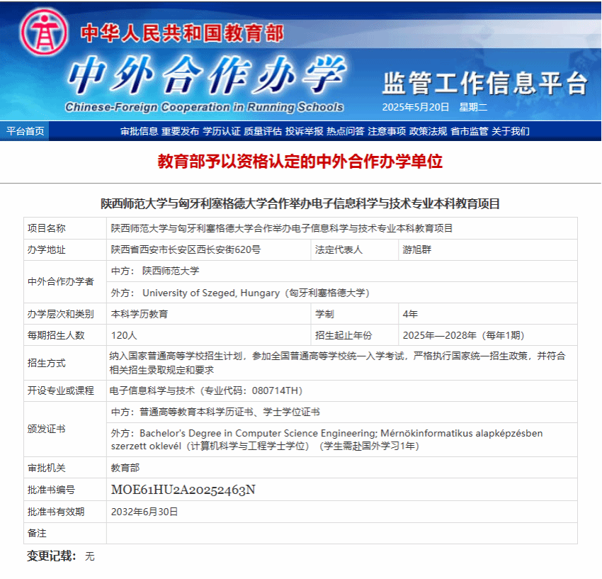5月13日,教育部中外合作办学监管工作信息平台公布了最新一批教育部予以资格认定的中外合作办学项目。依托公司教育部国家级一流本科专业建设点及省一流本科专业—电子信息科学与技术专业,公司与匈牙利塞格德大学合作举办的电子信息科学与技术专业本科教育项目获批,实现了公司办学历史上中外合作办学“零”的突破。
