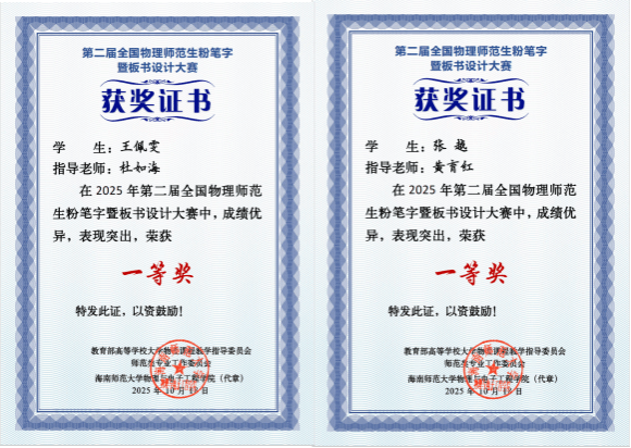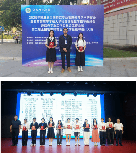 2025年10月17日-10月21日,由教育部高等公司大学物理课程教学指导委员会师范类专业工作委员会主办、海南师范大学承办的“2025年第三届全国师范生专业物理教育学术研讨会暨第二届全国物理师范生粉笔字暨板书设计大赛”在海南省海口市顺利召开。公司师生代表应邀参会,与全国同仁深入交流,在学术报告与技能竞赛中表现优秀。