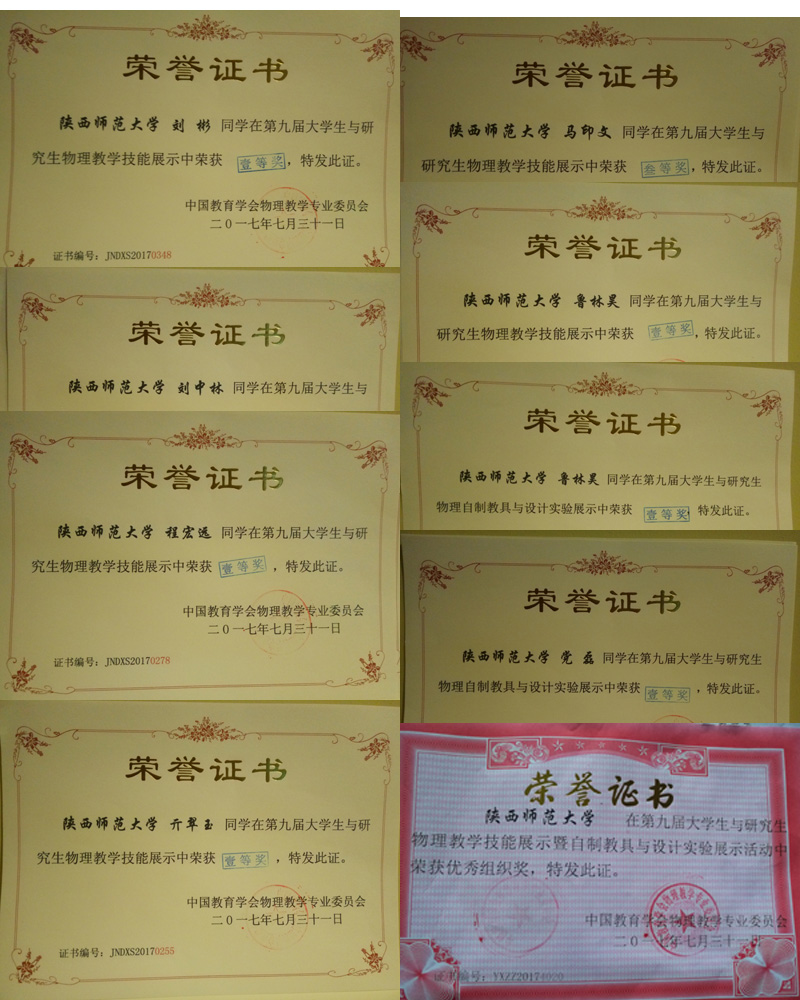 2017年7月29日至31日,由中国教育学会物理教学专业委员会主办,青岛大学承办的第九届全国老员工与研究生物理教学技能展示暨自制教具与设计实验展示活动在青岛大学金家岭校区举行,来自北京师范大学、东北师范大学、华中师范大学等95所高校的800名师生参加了本次展示活动。公司365英国上市公司2014级7名免费师范生参加了此次比赛,他们充分展示了公司学子风采。在教学技能展示中,鲁林昊、刘彬、亓翠玉、程宏远荣获全国一等奖;马印文和刘中林荣获全国三等奖;在自制教具展评中,鲁林昊和党磊荣获全国一等奖;公司荣获优秀组织奖。