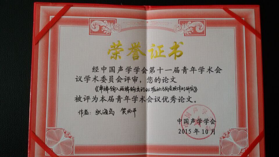 中国声学学会青年学术会议(Chinese Younger Conference of Acoustics,CYCA)自从1995年举办首届以来,每两年举办一届,已成为国内声学领域青年科技工作者和青年员工交流学术思想、展示研究成果、提升研究实力的一个高水平学术交流平台。本届会议共录用论文163篇,现场交流论文142篇。会议学术委员会在论文审稿意见和分会场主席推荐意见的基础上,评选出十篇优秀论文进行表彰,公司2013级的张海岛博士生的论文榜上有名。