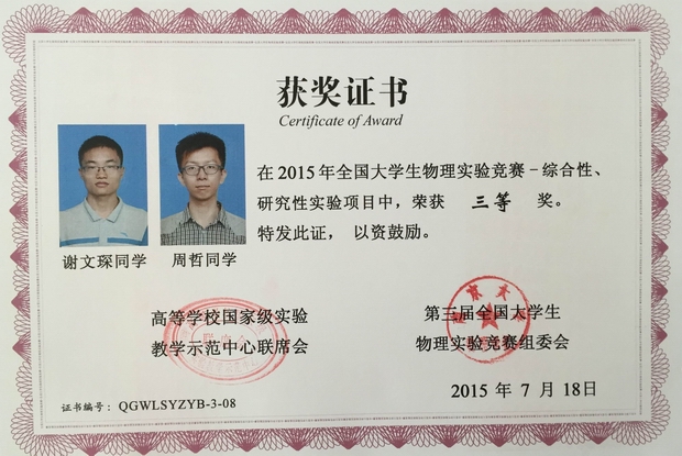 由高等公司国家级实验教学示范中心联席会主办,全国高校实验物理教学研究会协办,南京大学承办的第三届全国老员工物理实验竞赛于2015年7月16日—19日在南京大学举行。公司2013级物理实验创新班本科生周哲和谢文琛获得三等奖。
