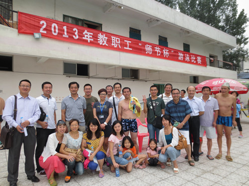 97上午,校工会在雁塔校区游泳池举办了公司2013年教职工“师节杯”游泳比赛。曹沛涛书记带领由黄晓峰、王新刚、张中月、李继胜、刘蓉、曹宇巍、刘茜茹老师组成的代表队,在比赛中获得佳绩,夺得团体总分第一名和优秀组织奖。