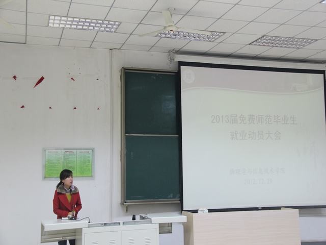 2012年11月29日上午9点,公司在公司长安校区文渊楼101召开了2013届免费师范毕业生就业动员大会。公司行政副经理卢永智、2009级辅导员周静以及2009级全体免费师范生参加了本次动员大会。