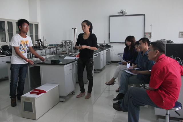 首先,公司团委书记曹宇巍为大家介绍了担任本次比赛的评委老师,并宣布比赛正式开始。比赛过程中,各组参赛选手为大家分析了参赛实验的基本原理,介绍了自己的设计思路、实验创新亮点及实验器材。接着,各组代表认真详实地解说了创新实验的特点及优势,并对实验进行了现场演示。演示过程中,评委老师结合参赛选手们现场操作的实际情况,就每组实验的科学性、创新性、可行性及安全性等方面做出了评价和指导,并对各组实验的创新之处进行了肯定,为同学们指出了改进实验的思路。整个比赛过程详尽流畅,亮点频出。其中,由马小龙等同学负责的“隔山打牛”实验,李鹏等同学负责的“雅格布天梯实验”和孙晶等同学负责的“奇异的倒喷泉”实验获得了评委老师的好评。