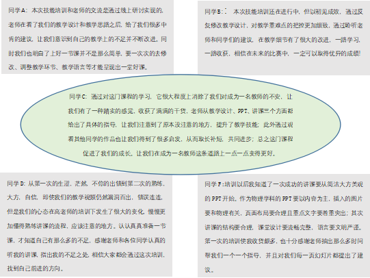 员工积极参与:作为准教师的师范生,关注课堂教学实践,提升个人专业素养,提升教学实践能力是他们在大学期间必须要做到的。在推迟开学期间,同学们积极利用各种网络技术,克服各种困难,在指导教师的引导下,有计划、有方法、有手段的参与到教学技能提升训练过程中。有同学使用了电视投屏软件,使大家能直接观察他讲课的具体过程,有身临其境的感觉;有同学使用软件进行视频编辑,将录制好的板书授课部分和PPT播放部分进行合成,达到了很好的视频展示效果,同时将制作方法共享使同学们都能受益;有同学利用家里的器材制作了简单的道具完成了一系列的小实验,使自己的讲课视频更加生动有趣;有同学由于条件限制无法制作PPT文档,通过在A4纸拼成的“黑板”上完成了自己的模拟授课过程。