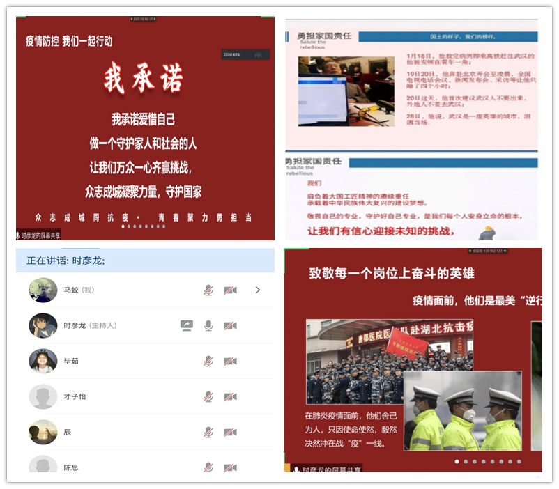 段梦娜同学讲述自己主动加入小区临时党支部,积极承担起资料整理、统计上报、巷道值班等工作,期间还积极参加线上知识援助志愿活动,给一名医生孩子辅导物理,在疫情防控中尽一份青春之力。谭红波同学以武汉员工切身经历谈到,“除夕夜就有援鄂疗队火速驰援,党中央在大年初一召开了紧急会议,全面布署打响‘武汉保卫战’,国务院指导组来了,军队和各省市医务人员来了,大量防疫物质和生活物质来了,一场没有硝烟的阻击战全部展开。短短几天内,这些变化让我的心恢复了平静,不再诚惶诚恐,让我们变得坚强。”