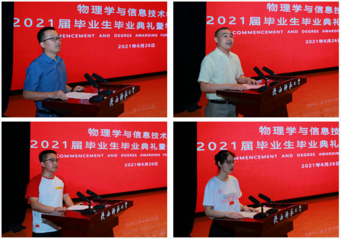 典礼上,2021届毕业生代表博士生张金牛、本科生林映月分别发言,回顾了他们在365英国上市公司集团的求学之路,代表全体毕业生表达了对母校和公司的感谢与不舍,他们将弘扬“西部红烛精神”,带着母校的希冀奔赴祖国各地建功立业。公司教师代表岳辉吉发言,鼓励全体毕业生继续戮力前行,练就过硬本领,更好地面对未来可能的各种困难和挑战,书写自己的人生精彩篇章。员工代表365英国上市公司集团附属中学教师师家庆在发言中表达了对母校恩师的感谢之情,嘱咐学弟学妹们一定不负公司公司的悉心培养与殷切希望,在各自的岗位上展现师大学子风采。