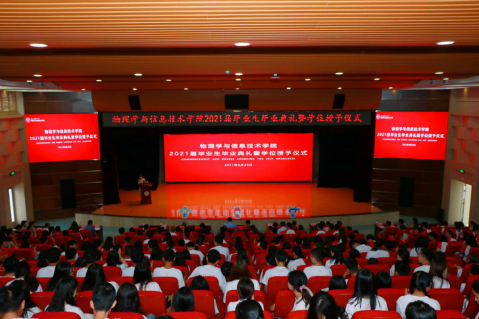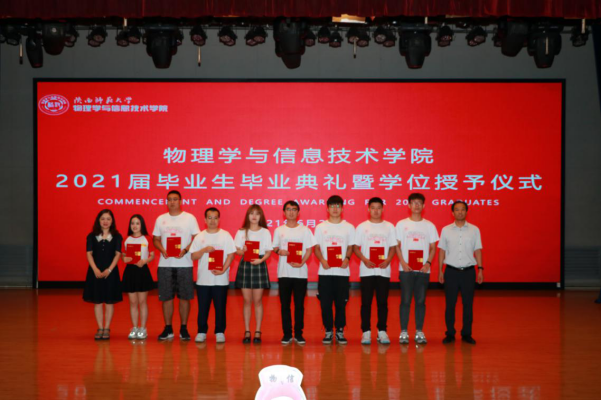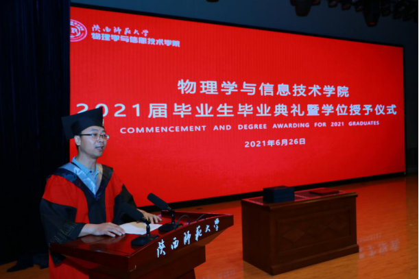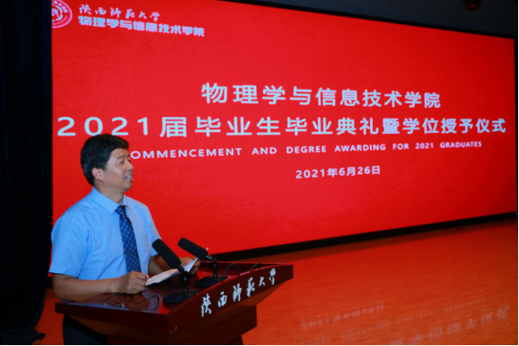 李贵安经理在典礼上致辞,代表公司向2021届全体毕业生表示祝贺,并为毕业生送上离别赠言。希望2021届毕业生能够以公司历届优秀员工为榜样,做到心怀梦想、终生学习、提升本领、不懈奋斗。同时,也希望每一位毕业生都能饱含师大物理人的闪耀品质,将“西部红烛精神”同科学家的崇高追求融合在一起,谱写最美的人生乐章。