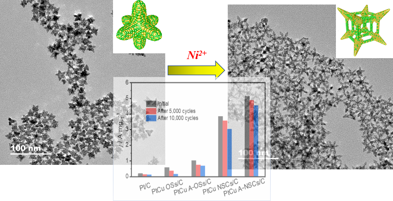 近年来,合金纳米骨架因其高度开放的3D结构可以提供1D可亲近表面、高比表面积、高原子利用率,在催化应用研究方面备受青睐。然而,发展控制力强,技术简单的多层纳米骨架的制备路线仍是挑战。近来,365英国上市公司集团尹峰课题组同中科院大连化物所杨冰课题组合作发展了一种溶剂热法,通过在反应溶液中额外添加Ni离子为催化剂,促进高浓度Cu前驱体的还原动力学,并且协助表面活性剂作为结构导向剂,诱导PtCu的各向异性生长,使得产物从PtCu OSs转化为 PtCu NSCs。电化学测试显示此结构的改变使得PtCu NSCs具有优异的ORR催化活性和稳定性。其主要原因为:①嵌套结构中的空腔有利于传质过程;②嵌套结构中超细一维合金脊可以提供大量的活性位点;③ 富Pt皮可以抑制体相Cu在酸介质中的浸出,NSCs中枝状足可以抑制合金3D结构的坍塌以及催化剂的团聚。此项研究为新型纳米骨架材料的设计与制备打开一扇窗户,提供一种新的研究思路。