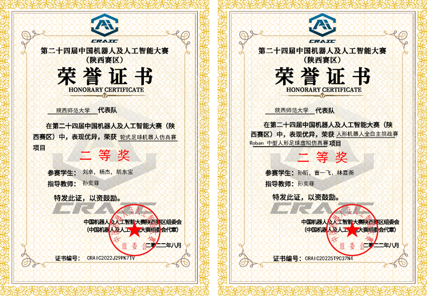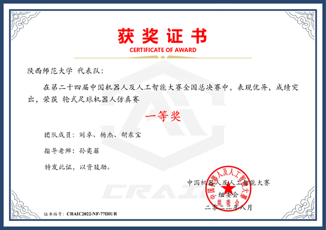 近日,由中国人工智能学会、慈溪市人民政府共同主办,中国人工智能学会机器人文化艺术专业委员会,慈溪市数字经济协会,环杭州湾(慈星)智能产业园,哈尔滨工业大学计算学部承办的第二十四届中国机器人及人工智能大赛全国总决赛(线上)落下帷幕。经过三天激烈的角逐,由公司孙奕菲副教授指导,公司研究生刘卓、杨杰,本科生胡东宝组成的“SNNU-ALPHA”队荣获轮式足球机器人仿真赛项全国一等奖。