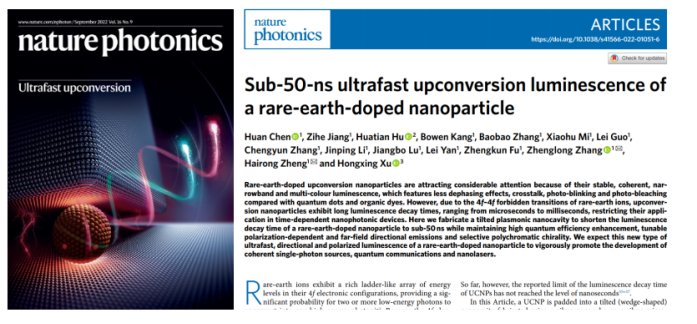近日,我院郑海荣教授和张正龙教授带领的纳米光学团队在国际著名科研期刊《自然·光子学》(Nature Photonics)发表了题为“稀土离子的亚50纳秒超快上转换发光”(Sub-50-ns ultrafast upconversion luminescence of a rare-earth-doped nanoparticle)的文章,文章介绍了该团队在纳米光学和稀土发光领域取得的重大突破,该成果被选为Nature Photonics2022年9月期的封面文章。公司为第一且唯一通讯单位,光学专业硕博连读研究生陈环同学为第一作者,张正龙教授和郑海荣教授为共同通讯作者。