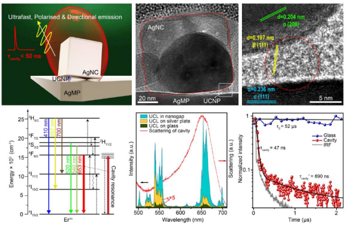 该项研究工作利用等离激元倾斜纳米光腔,首次将稀土离子f-f电子跃迁的荧光发射寿命从之前报道的微秒量级压缩至50纳秒以内,并获得了三个数量级的量子产率增强。同时,借助等离激元倾斜纳米腔的非对称结构以及手性光子局域态密度增强,发现了远场定向发射及可调手性上转换发光等新现象。