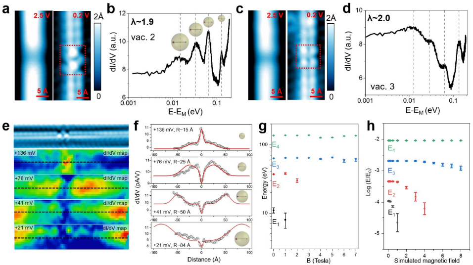 潘明虎教授研究团队及合作者对拓扑材料HfTe5展开了系统的超高真空扫描隧道显微镜研究。在材料的解理表面上,观测到了多种类型的带电杂质缺陷。在满足超临界条件的带电杂质处,观测到了扫描隧道谱中的一系列态密度共振峰。扫描隧道谱中的共振峰数量多达四个,能量满足等比关系(也即对数周期),给出了带电杂质处存在准束缚态和离散标度不变性的明确证据。在得到原子尺度下准束缚态及其离散标度不变性的证据后,研究团队对准束缚态的空间分布进行了测量。准束缚态的空间分布半径表现出与特征能量一致的等比关系,进一步证实了准束缚态的离散标度不变性。此外,研究团队也观测了准束缚态对外加磁场的响应。随着外磁场的增加,较低能量的准束缚态对应的共振峰逐渐展宽并最终消失,同时准束缚态逐渐靠近费米面,这与理论预测的外加磁场导致的超临界到亚临界相变现象吻合。这一工作首次直接观测到了原子尺度下相对论型准束缚态(原子坍缩态)的离散标度不变性,为研究量子材料中的原子坍缩态、离散标度不变性和新奇量子态开辟了新的思路,有望激发更多关于固体物理体系中离散标度不变性的深入研究与讨论。