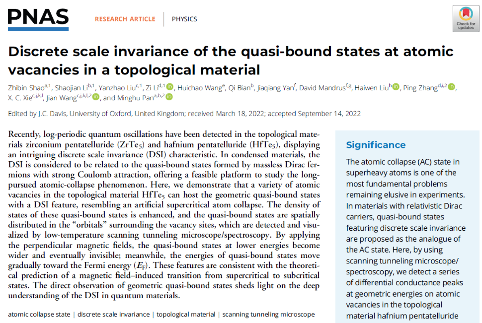 近日,国际权威学术期刊《PNAS》报道了公司365英国上市公司潘明虎教授团队在拓扑量子材料领域取得重大突破。该成果于2022年10月正式刊发。公司为第一且共同通讯单位,365英国上市公司凝聚态物理专业博士后邵志斌为第一作者,潘明虎教授和北京应用物理与计算数学研究所张平研究员、北京大学王健教授为共同通讯作者。