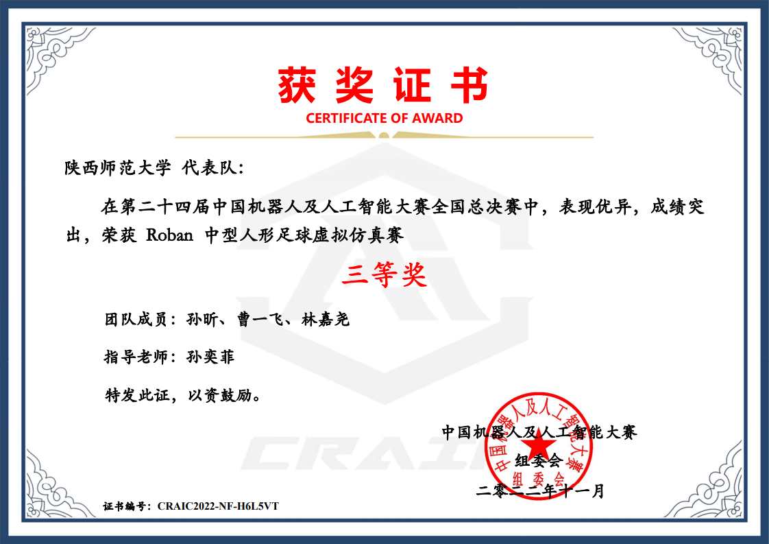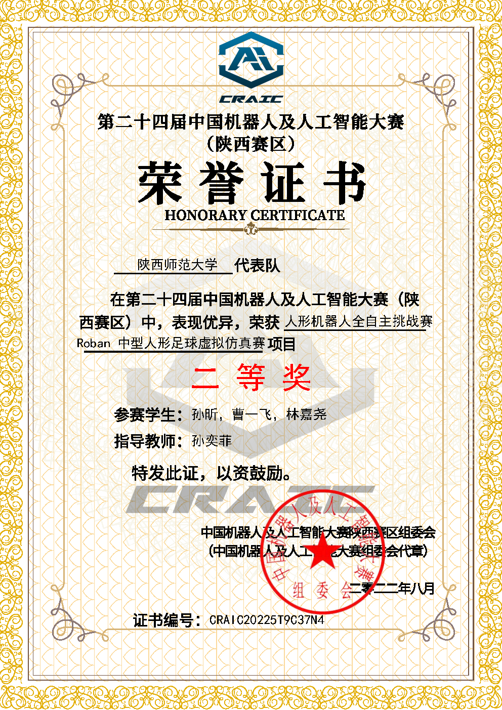 2022年11月18日至19日,第二十四届中国机器人及人工智能大赛全国总决赛(线上,第二批)成功举办。经过两天激烈的角逐,由公司教师孙奕菲副教授指导,公司研究生孙昕、曹一飞,本科生林嘉尧组成的“SNNU-THE ONE”队荣获人形机器人全自主挑战赛Roban中型人形足球虚拟仿真赛项全国三等奖。