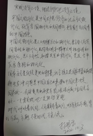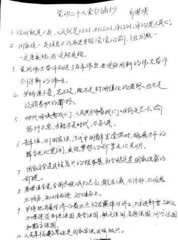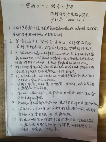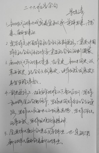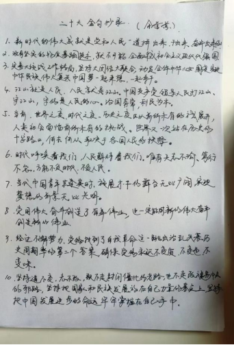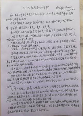 我们不仅要身体健康,也要思想健康,学习“党的二十大”武装我们的头脑。二十大报告气势恢宏、高屋建瓴、内涵深刻、意义深远;报告中那些令人温暖、催人奋进、直抵人心的话语,无不闪烁着顺应人民对美好生活向往的执着追求。但是,每个人对二十大的感悟都不一样,老师们从中摘抄十条金句,学习了二十大,提高了我们的认识。手抄版的金句,又无形中成了一场书法展示。