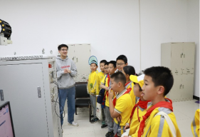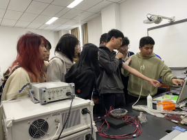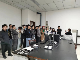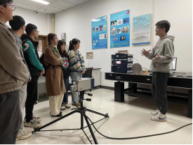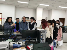 参观声信息分析及处理实验室 声学专业硕士生江小斌向同学们简单讲解如何用超声去探测器件内部有无损伤,以及如何去分析定位器件损伤位置。同学们认真听讲,并积极参与了演示实验。