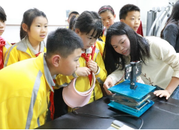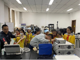 参观超声振动系统测量实验室 声学专业博士生王莎和硕士生董宜雷向同学们展示了超声换能器的振动模态,讲解了超声换能器的原理及在生活中的应用。通过有趣的互动,让同学们明白了超声是如何产生的以及超声能给人们的生活带来的改变。