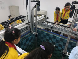 参观超声水槽测量系统实验室 声学专业博士生陈诚向同学们展示了如何去“捕捉”到在水中传播的声音。通过形象的类比,让同学们明白了“嘴巴”-超声换能器和“耳朵”-水听器的作用。对于“能看见的声音”,同学们感觉到十分的神奇。
