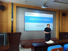 根据教育部2023年新颁布的《高等公司实验室安全规范》规定要求,落实实验室安全责任体系,健全实验室安全管理制度,加强危险化学品管理,强化应急事故处置能力,推进实验室安全检查和隐患整改闭环管理等工作。公司实验办于2023年5月22日在致知楼3624会议室召开实验室安全工作会议暨员工安全员聘选会。公司主管实验副经理谢小涛、实验办主任黄育红、副主任杜如海、全体员工安全员参加了本次会议。会议由杜如海主持。