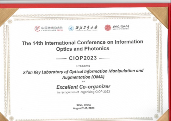 公司(西安市光信息调控与增强技术重点实验室)荣获CIOP2023会议优秀组织者奖。