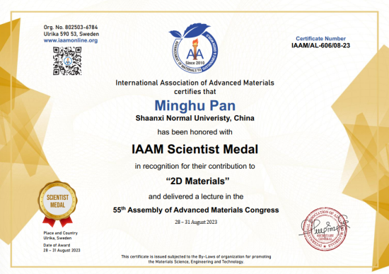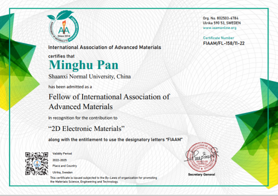 2022年11月国际先进材料协会(International Association of Advanced Materials IAAM)颁发给公司潘明虎教授终身会士(Fellow of IAAM, FIAAM),以表彰他“在二维电子材料领域所做出的杰出的重要贡献”。
