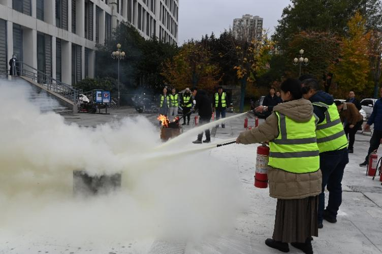 现场模拟致知楼三段2楼东侧发生“火情”,火势迅速向各楼层蔓延,现场浓烟滚滚,且3楼西侧有人员受伤,情况危急,启动公司火灾应急预案,各小组立即展开行动。警报声响起,公司师生用湿毛巾捂住口鼻,低姿、快速地穿越“烟雾”区,按照预定的疏散路线进行撤离,赶往指定的安全地带,楼层负责人确认本楼层无滞留人员后,才离开危险区域前往指定安全区域集合。灭火组穿防火战斗服,携带灭火器到起火现场进行灭火;应急救助小组迅速将“伤员”救援至一层开阔地带。整个疏散过程迅速、有序,师生们均能在规定时间内完成撤离。