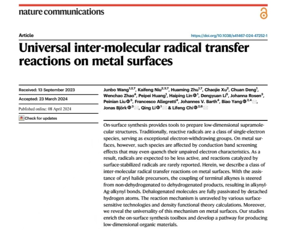 近日,公司李青教授团队与苏州大学迟力峰院士团队、瑞典林雪平大学Jonas Björk教授团队、德国慕尼黑工业大学Johannes V. Barth教授团队等合作,在国际权威学术期刊《自然·通讯》(Nature Communications)上发表题为“Universal inter-molecular radical transfer reactions on metal surfaces”的研究成果。该研究开创性地揭示了苯自由基触发的分子间自由基迁移反应的物理机制,并成功利用此机制在金属表面实现对芳基炔烃分子反应的精准调控,为新材料和新器件的开发提供了重要的研究思路和理论基础。该论文于2024年3月23日被《Nature Communications》接收,并于2024年4月8日正式发表。公司为第一且共同通讯单位,公司博士后王俊波(合作导师李青教授)为第一作者,瑞典林雪平大学博士后牛凯丰和公司博士研究生朱华明(指导导师李青教授)为共同第一作者。公司李青教授,苏州大学迟力峰院士、德国慕尼黑工业大学杨标教授,瑞典林雪平大学Jonas Björk教授为共同通讯作者。该成果获得中央高校基础研究基金和国家自然科学基金等项目的支持和帮助。